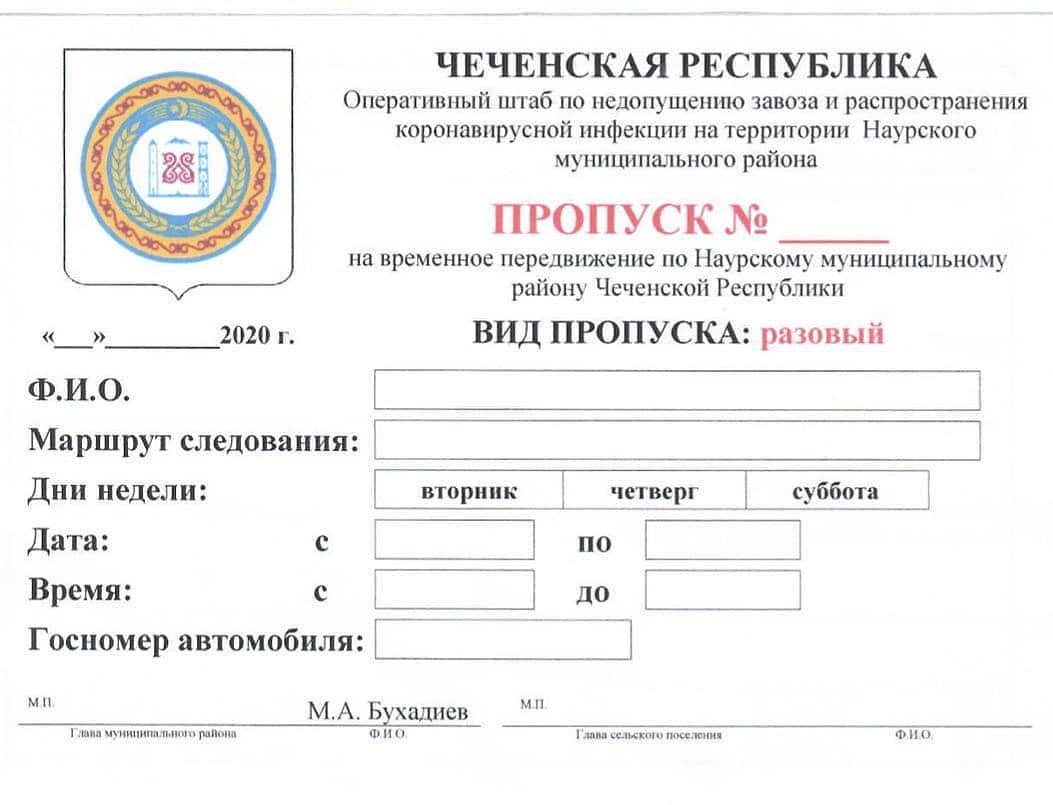 района, а также всей республики вводится пропускной режим. В связи с этим, для поездок (хождения) по продуктовым магазинам или по другим неотложным делам, разрешается передвижение только внутри населённого пункта, в определённое время и дни, строго по пропускам.Пропуска будут выдаваться на одного из членов семьи (домовладения или квартиры). Время действия пропуска ограничено по следующим критериям: три раза в неделю по два часа в определённые дни, т.е. на половину населения: понедельник, среда, пятница, а на вторую половину населения: вторник, четверг, субботу.В воскресенье всем запрещается🚫 выходить из своего домовладения или квартиры.Время действия пропуска будет разбито на пять периодов:С 08:00 до 10:00;С 10:00 до 12:00;С 12:00 до 14:00;С 14:00 до 16:00;С 16:00 до 18:00.Пропуска с регистрационными номерами будут доставляться на дом.По всем интересующим вопросам вы можете круглосуточно обращаться на номера "горячей линии" Оперативного штаба Наурского муниципального района:8 (87143) 2-25-138 (963) 589-32-26