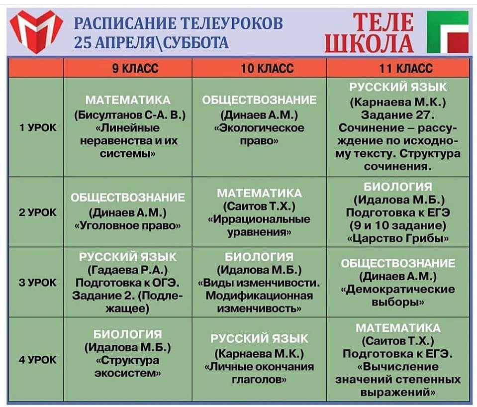 учащихся собирается у экранов телевизоров. Родители оценили новый формат обучения. Каждый день, с 9 утра лучшие учителя приходят к своим ученикам домой с экрана телевизора. Для учащихся 1-8 классов занятия проходят с понедельника по пятницу, для 9-11 классов - по субботам и воскресеньям. Предлагаем познакомиться с расписанием уроков на 25 апреля!