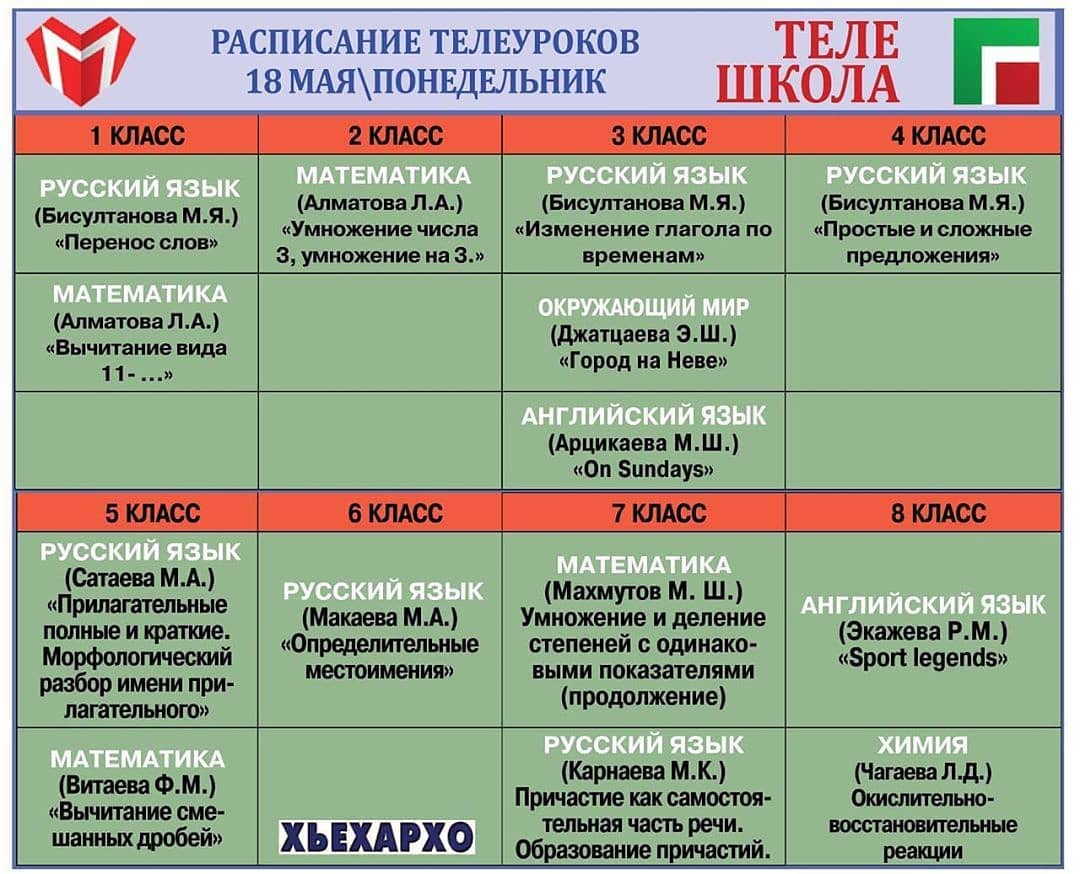 18.05.2020Расписание телеуроков для школьников на 18 мая. Занятия продолжительностью до 10 минут начинаются в 9.00. Отметим, что все образовательные выпуски телепроекта доступны для просмотра на сайте Министерства образования и науки ЧР по ссылке, указанной в шапке профиля