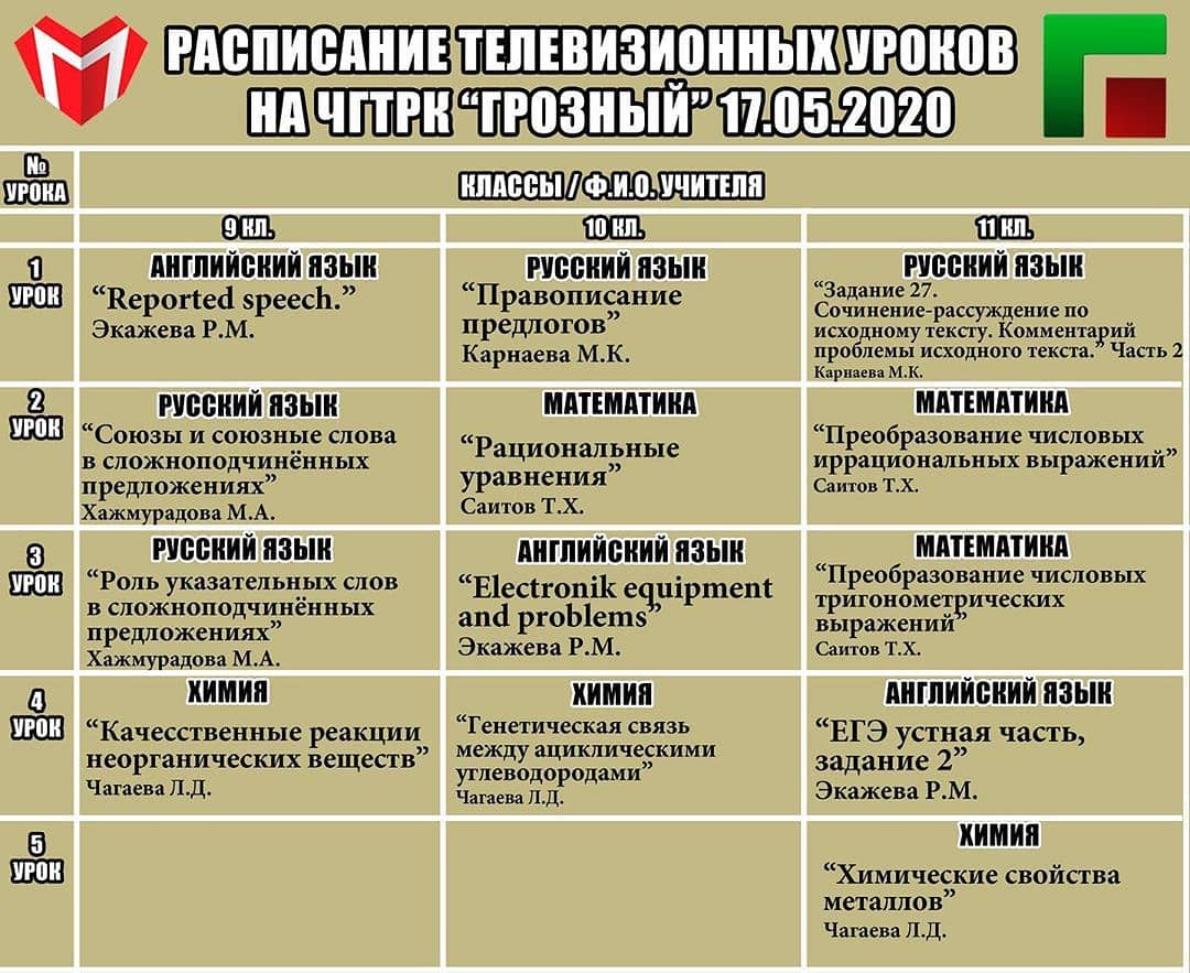 16.05.2020Уважаемые родители!Министерство образования и науки ЧР совместно с ЧГТРК «Грозный» продолжает реализацию проекта «Телешкола»Представляем Вашему вниманию расписание занятий на 17.05.2020.Расписание также опубликованоНа сайте Министерства образования и науки ЧР mon95.ru и доступно по ссылке в шапке профиля.Уроки проходят с 9:00 в эфире ЧГТРК «Грозный».Оставайтесь дома и проводите время с пользой!