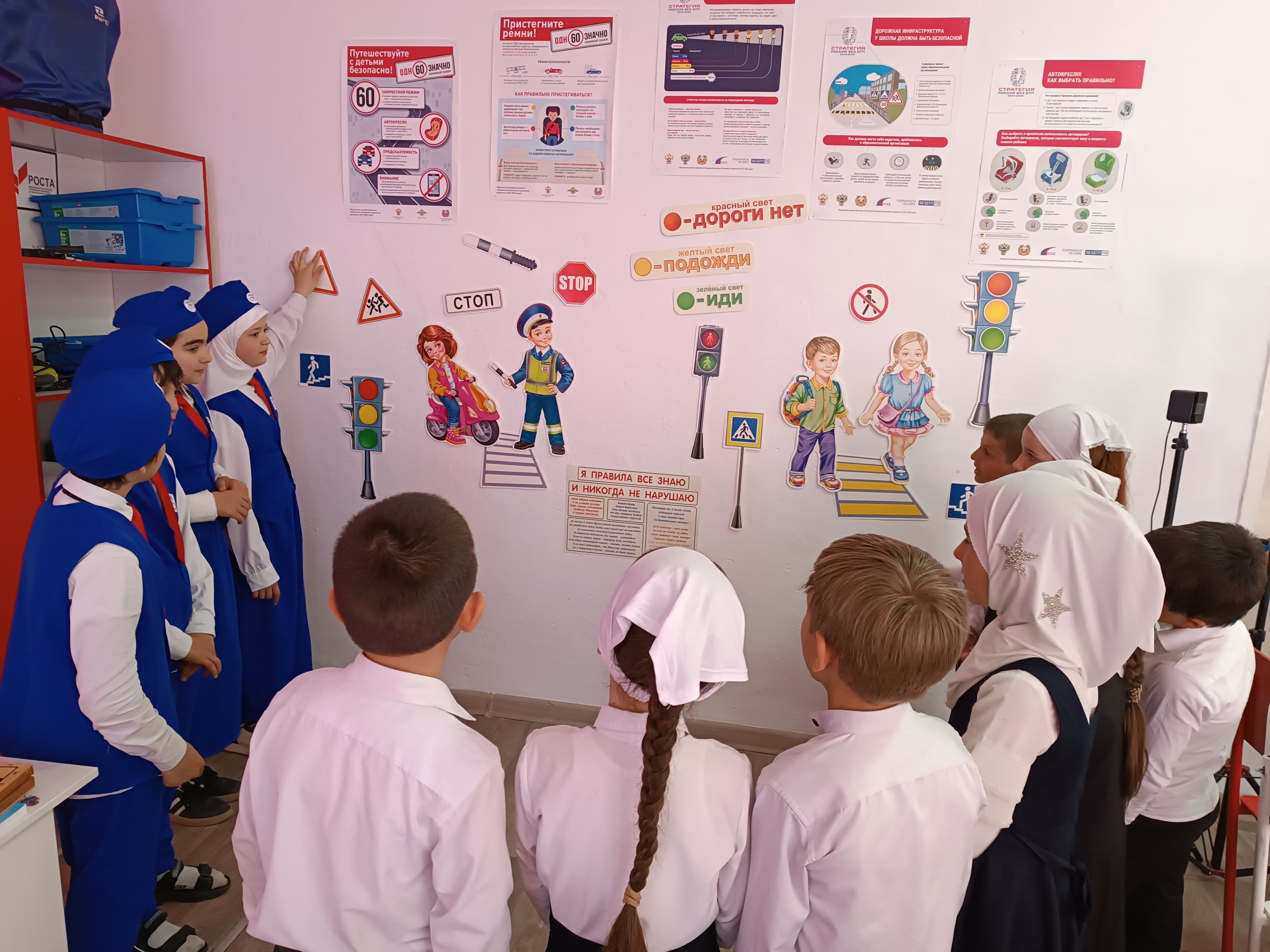 Члены отряда ЮИД «Светофор» и их руководитель Сулаев И.А. в игровой форме, рассказали ребятам 2-го класса о соблюдении правил дорожного движения. Особое внимание обратили на необходимость перехода проезжей части строго в установленных местах, безопасный выход на проезжую часть в зоне пешеходного перехода, на регулируемых пешеходных переходах, о безопасном поведении на дороге, об опасности использования современных гаджетов, капюшонов, наушников при переходе проезжей части. Юидовцы объяснили ребятам, как влияет на безопасность пешеходов использование светоотражающих элементов в темное время суток.